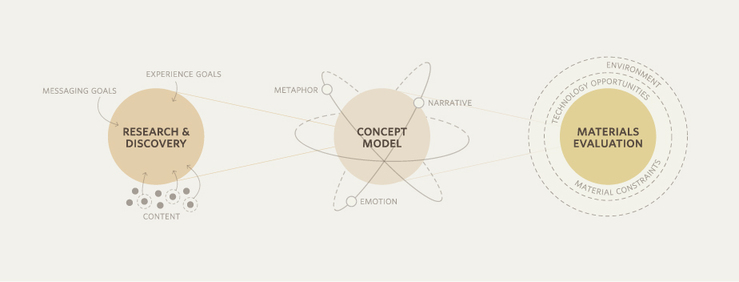 At this point, we had a holistic understanding of content, messaging, and strategy. We also understood the physical environment, as well as a powerful metaphor that could keep us on track. We designed concepts for three kinds of physical installations, each of which had its own set of communication goals, and took into account visitor pathways through the space:
