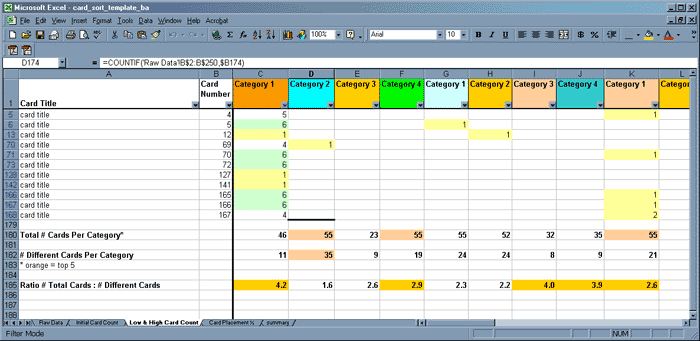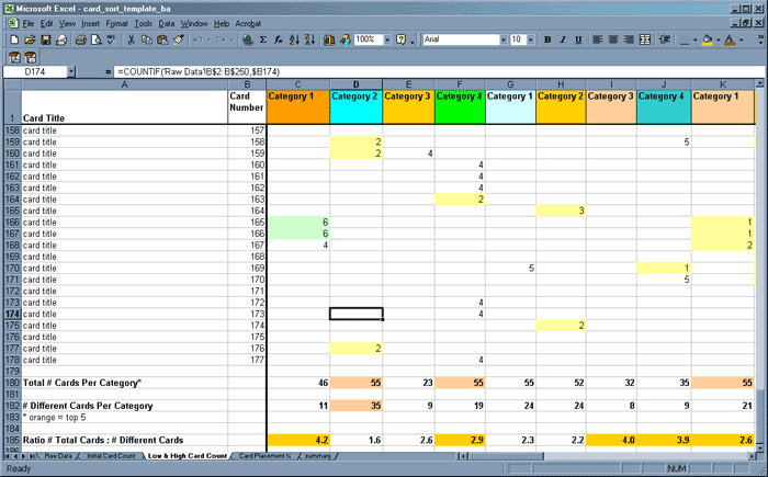 The template was developed as an analysis tool for interpreting the results of a card-sort exercise involving more than 100 items and approximately fifteen participants. The best known freely available automated card sorting tools (EZSort and WebCAT, for example) cannot work with item sets of this size. This template will accommodate 180 cards and 30 categories, but is easy to expand further via simple cutting and pasting of the cell references and formulae.
