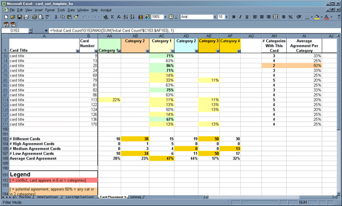 Card Placement Percentage worksheet. (Click to enlarge.)In the screenshot at left, look across the row for card #124. You’ll see that it appeared in Category 1 (column AC) 50% of the time, and in Category 3 (column AE) only 13% of the time. By contrast, looking at the categories where card #147 was placed, you’ll see that it appeared in Category 2 (column AD) 83% of the time. Clearly, a significant majority of participants agreed that this card belongs in Category 2 (column AD).