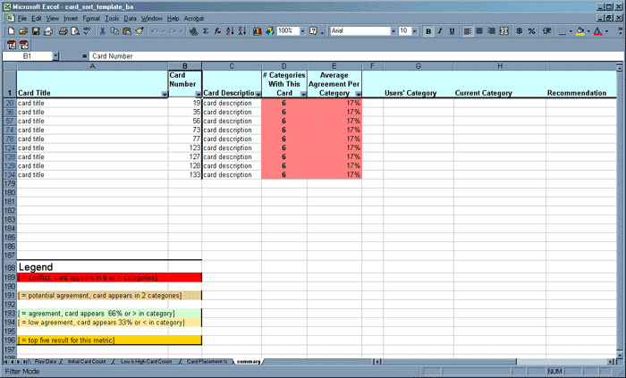 The template includes a column for the card numbers (column B), which you may need for later reference. I recommend including the descriptions that appeared on your cards in the worksheets, as it is much easier for people who did not directly conduct the study to read and interpret the results when they have the original card description readily at hand. I usually place the descriptions in a new column (column C, in this layout) adjacent to the card numbers; you can see this on the last worksheet, “Summary.”